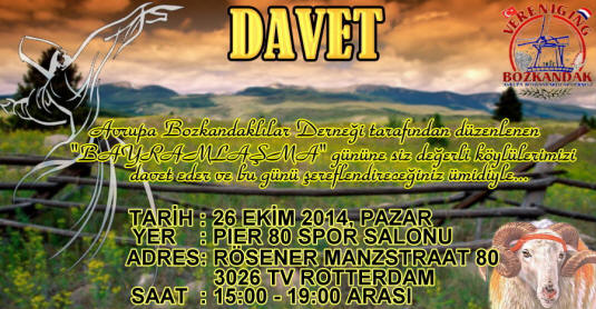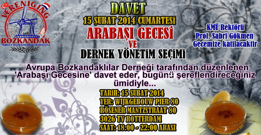 Dernek tüzüğü gereği 15 şubat 2014 Rotterdam’da Wijkgebouw Pier 80’ salununda Avrupa Bozkandaklılar Derneği olağan genel kurul toplantısı ven yönetim seçimi, üyelerin katılımıyle gerçekleşti. Gecemize KMÜ üniversitesi rektörü sayın Prof. Dr. Sabri Gökmen, Karaman İl Kültür ve Turizm Müdürü Cengiz Orta, TRT spikeri Acar Acartürk, HOKAV, BizBize Karaman vakfı temsilcileri ve bazı köy dernekleri temsilcileri basın mensupları katıldılar. Karaman İl Kültür ve Turizm Müdürü Cengiz Orta, TRT spikeri Acar Acartürk ve BizBize Karaman vakfı yönetim kurulu başkanı kısa birer teşekkür konuşması yaptılar. Dernek yönetimi tarafından gecenin sonunda misafirlerimize hediyeler takdim edildi.