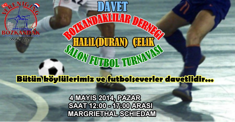 Avrupa Bozkandaklılar Derneği yönetimi tarafından yakın zamanda kaybettiğimiz onursal başkanımız Halil(Duran) Çelik anısına salon futbolu turnavası 4 mayıs 2014 Pazar günü Schiedam Margriethal Spor salonunda gerçekleştirildi.